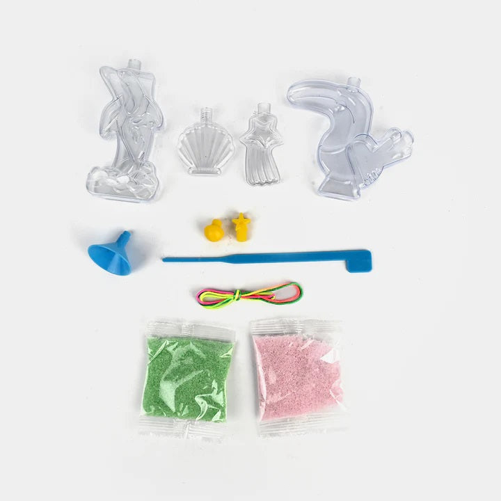 The kit contains materials to create 4 unique sand art shapes, including:
